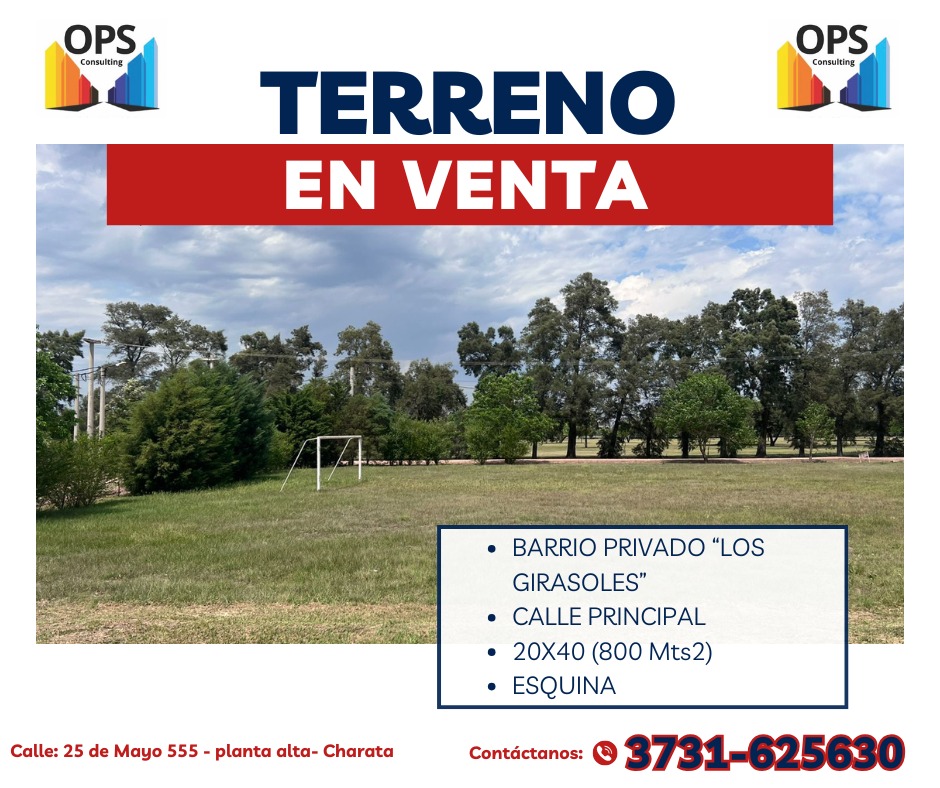 AMPLIO TERRENO DE 20X40 UBICADO EN EL BARRIO PRIVADO “LOS GIRASOLES” DE CHARATA, ESQUINA, SOBRE CALLE PRINCIPAL.